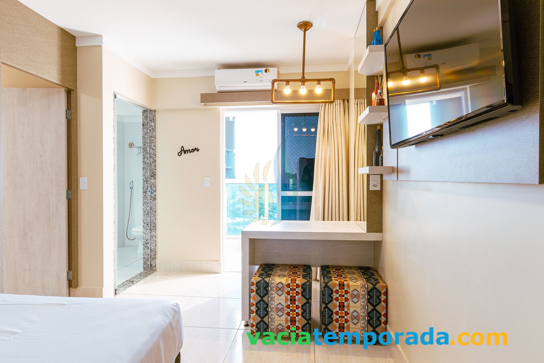 **Quarto: Cama casal box queen size2x2 , ar condicionado split, Smart TV 42" , roupeiro, cofre, e travesseiros de cortesia;