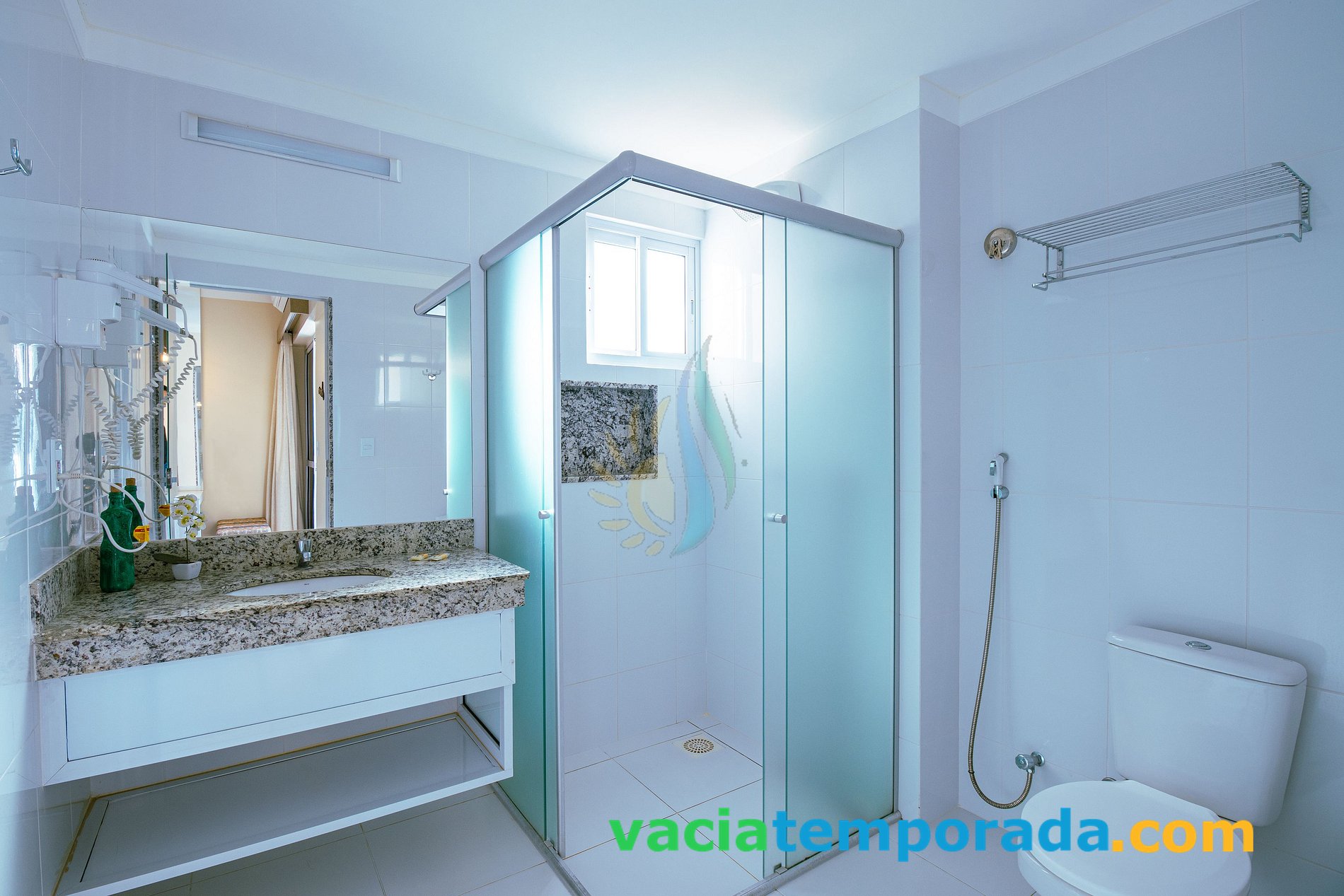 **Banheiro: com secador de cabelos,ducha hgiênica,sabonetes e papel higiênico;