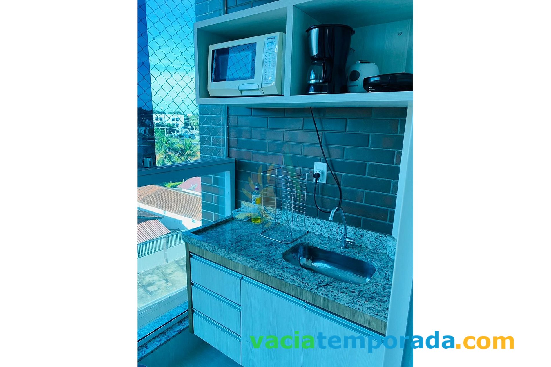 **Varanda gourmet: Geladeira ;lMicro-ondas ;Sanduicheira ;Cafeteira; Pratos, copos; talheres; Utensílios básicos de cozinha. (É proibido cozinhar no apartamento - Não tem fogão!)para rápidas refeições e lanches;