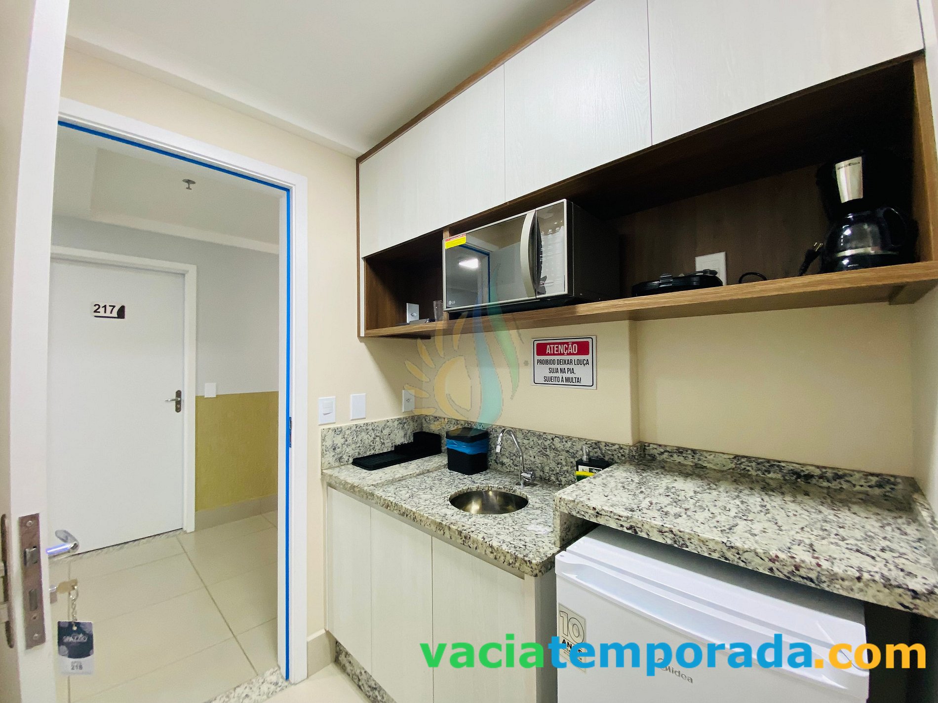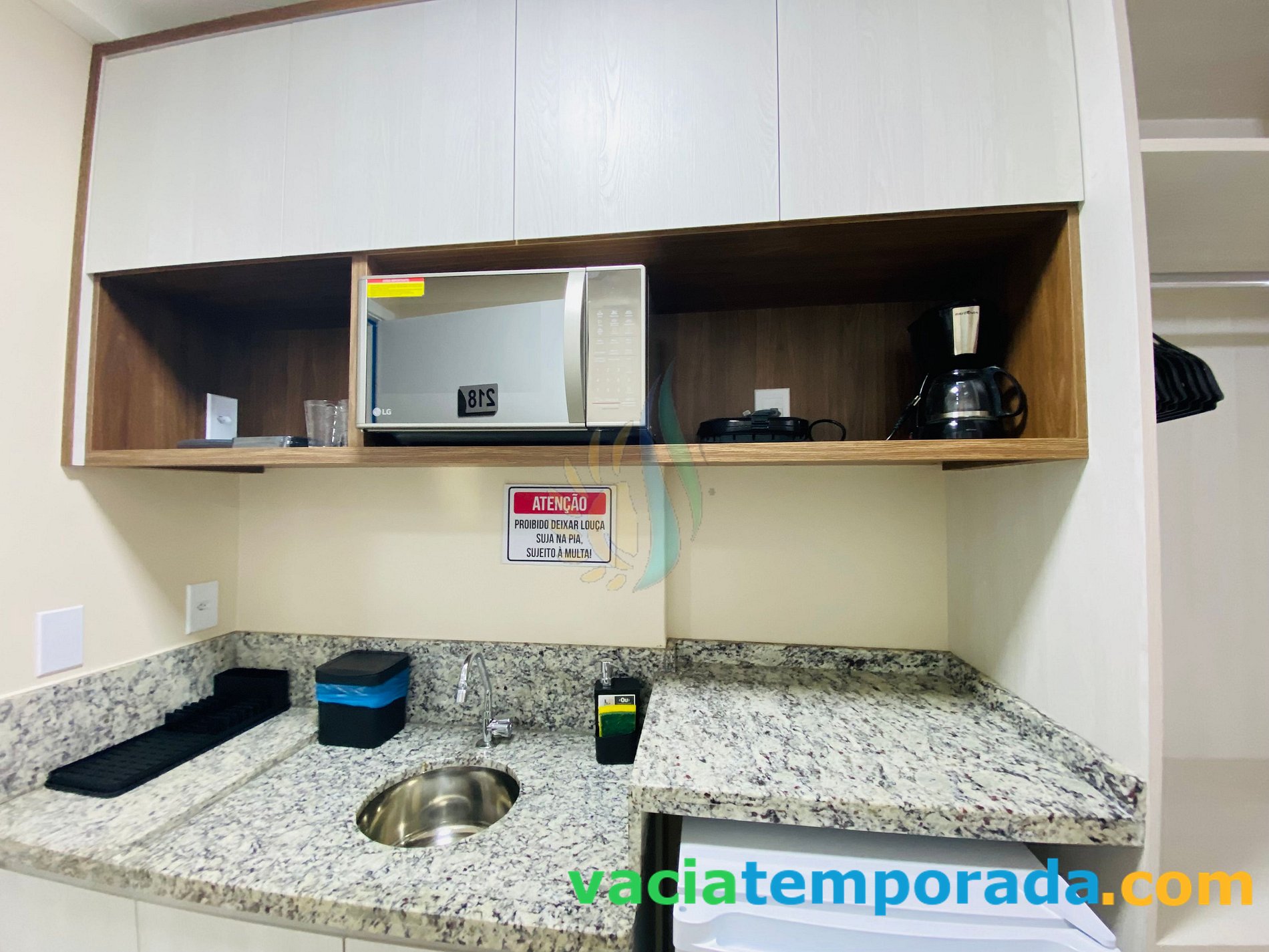 **Copa: frigobar ; Micro-ondas ;Sanduicheira ;Cafeteira; Pratos, copos, xícaras; talheres; Utensílios básicos para se fazer lanche. (É proibido cozinhar no apartamento (multa 30% valor condominio) Não tem fogão!