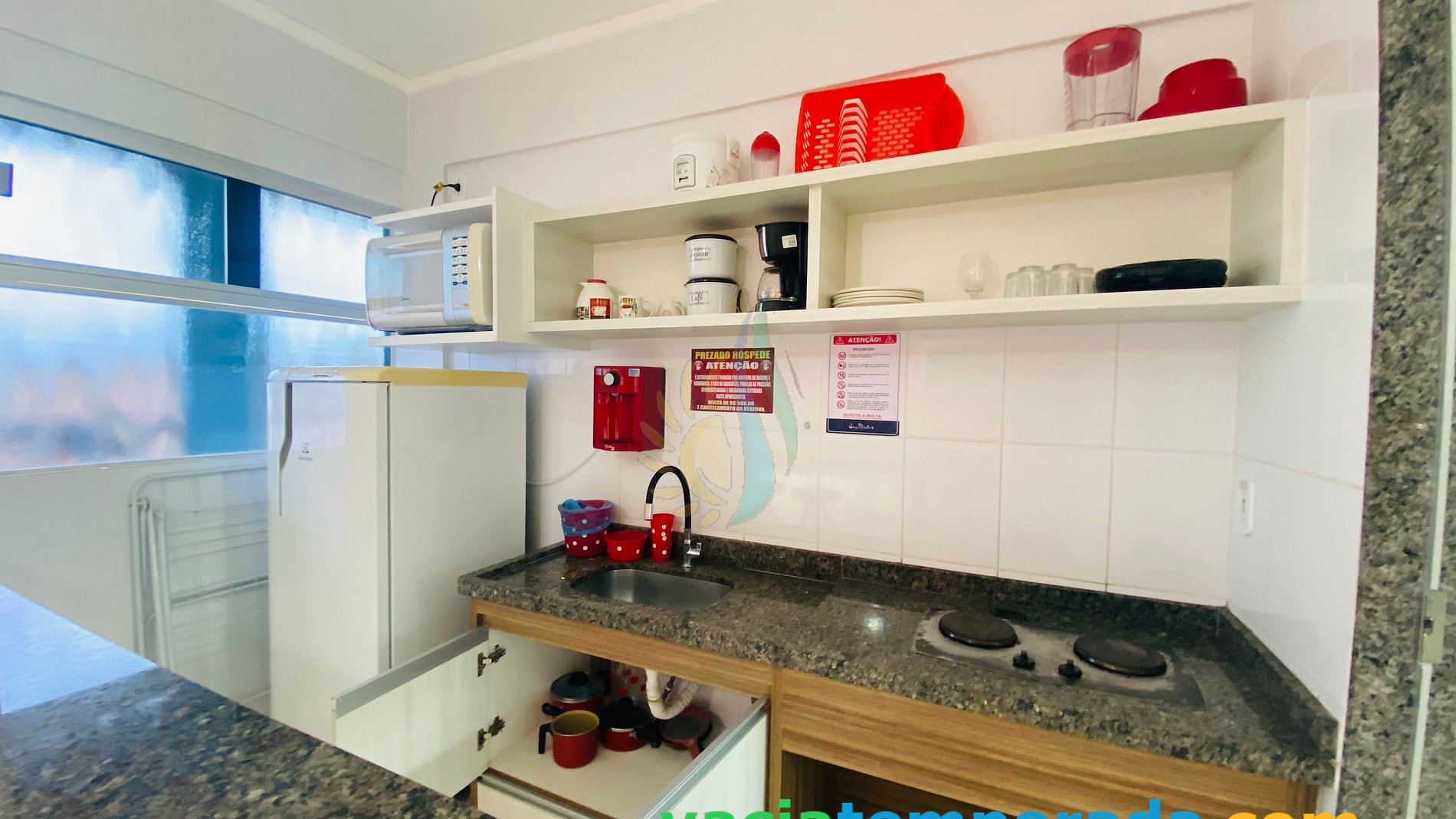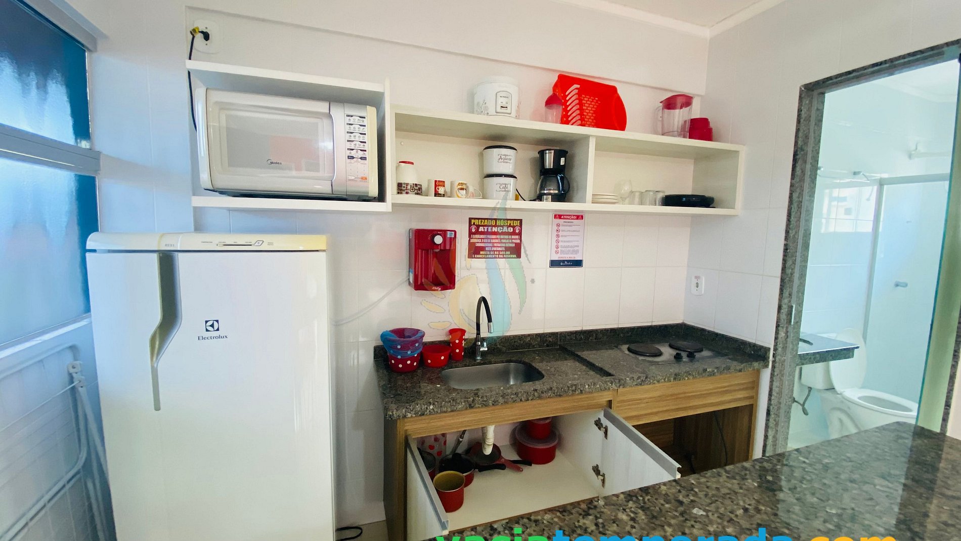 ✗ Cozinha equipada com: geladeira, Purificador de água natural;microondas, sanduicheira, liquidificador, fogão elétrico de duas bocas embutido na pedra e utensílios básicos para rápidas refeições e lanches