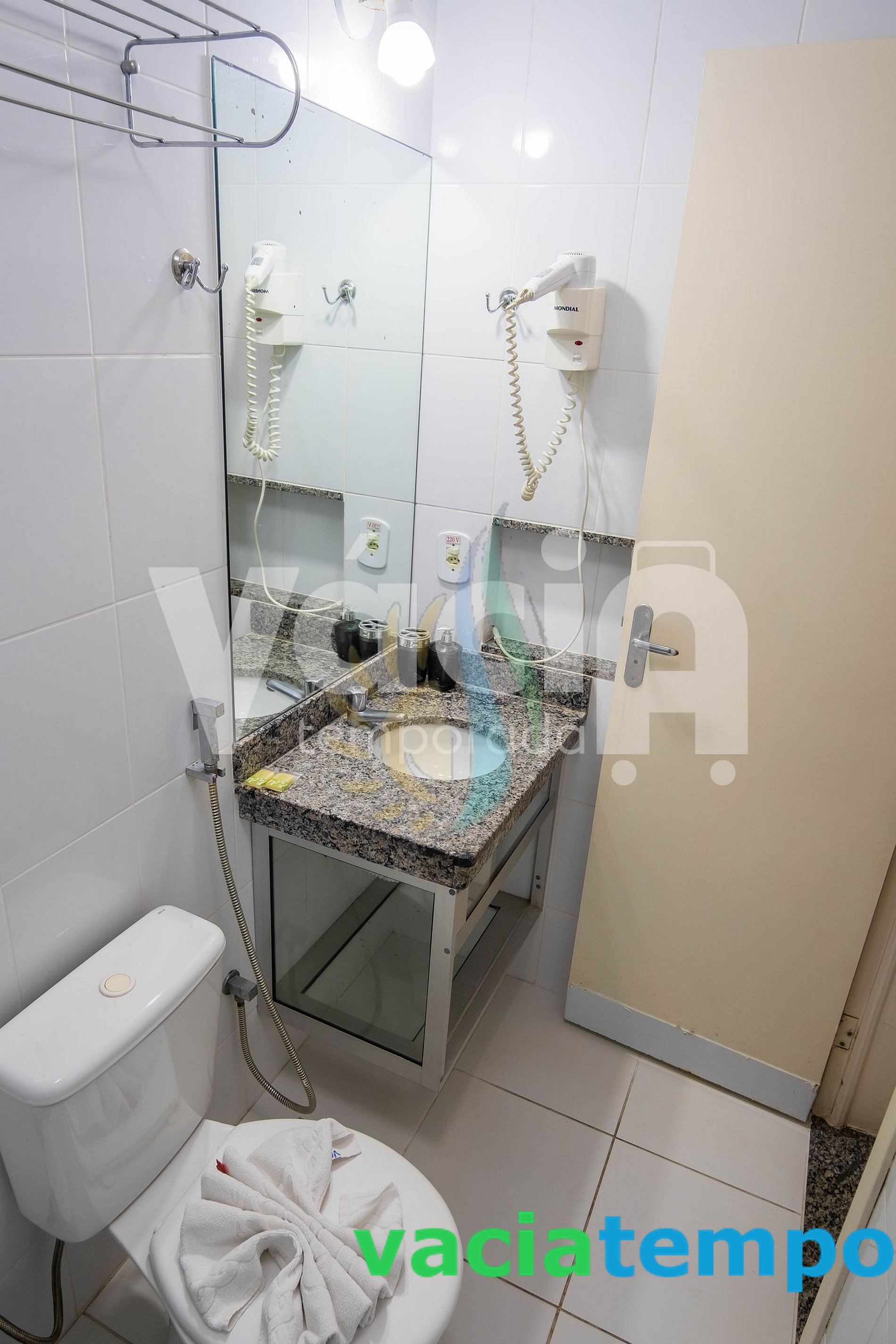 ✗ Banheiro com: com secador de cabelos,ducha hgiênica,sabonetes e papel higiênico;