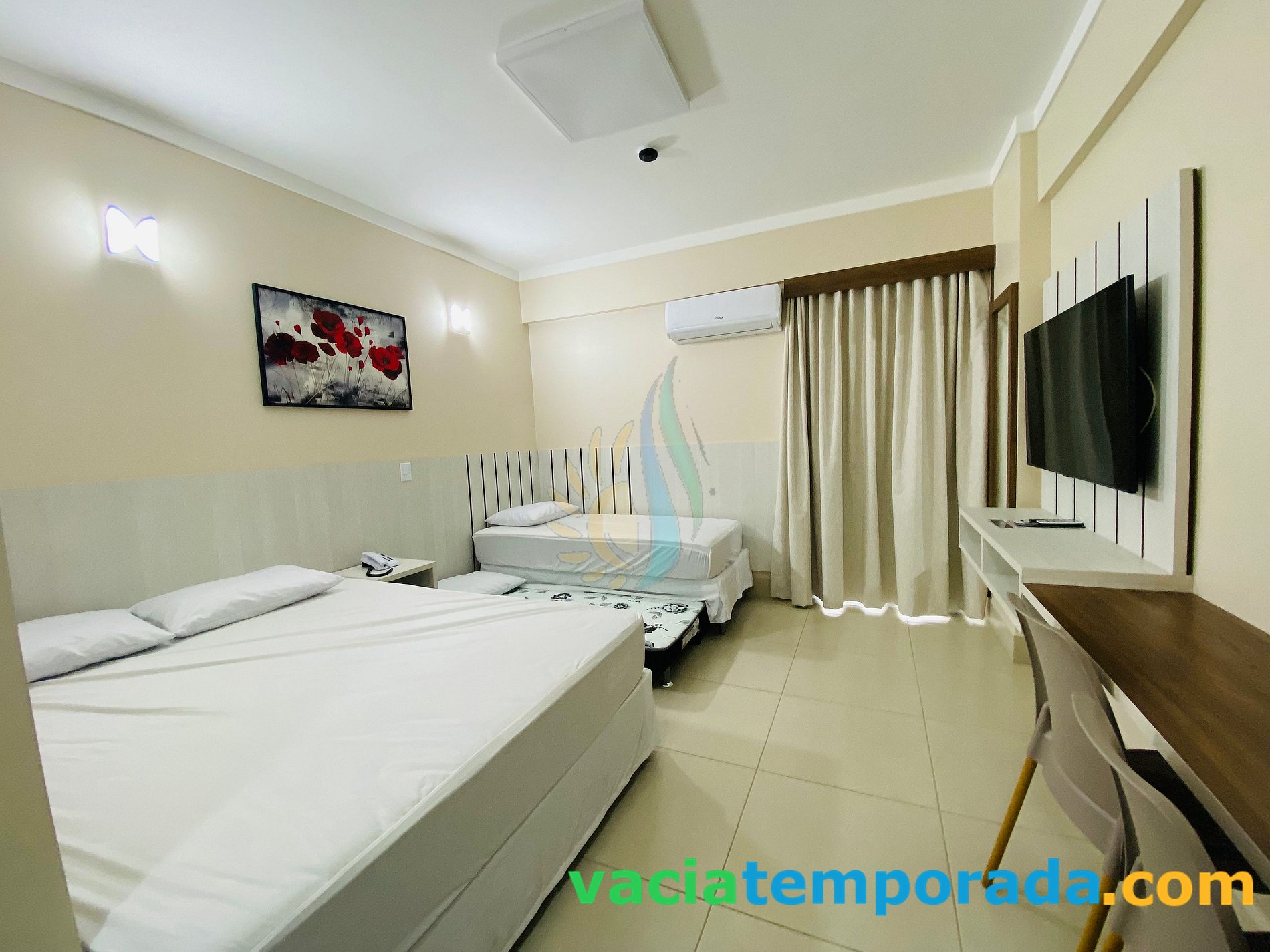 **Suite: cama de casal box padrão, bicama de solteiro, roupeiro, ar condicionado split, Roupa de cama e banho(SEM TROCAS DIARIAS) , Smart TV 50" , cofre digital, e travesseiro de cortesia;