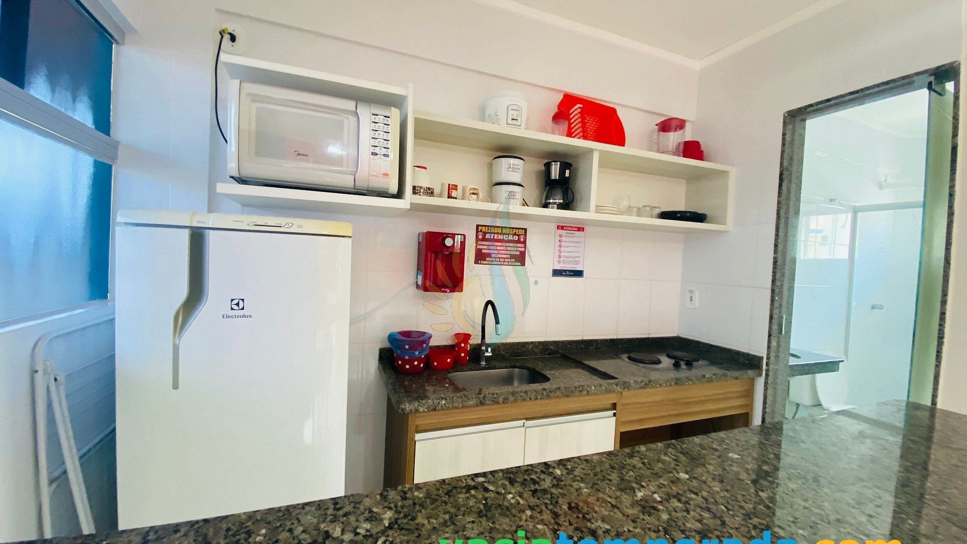 ✗ Cozinha equipada com: geladeira, Purificador de água natural;microondas, sanduicheira, liquidificador, fogão elétrico de duas bocas embutido na pedra e utensílios básicos para rápidas refeições e lanches
