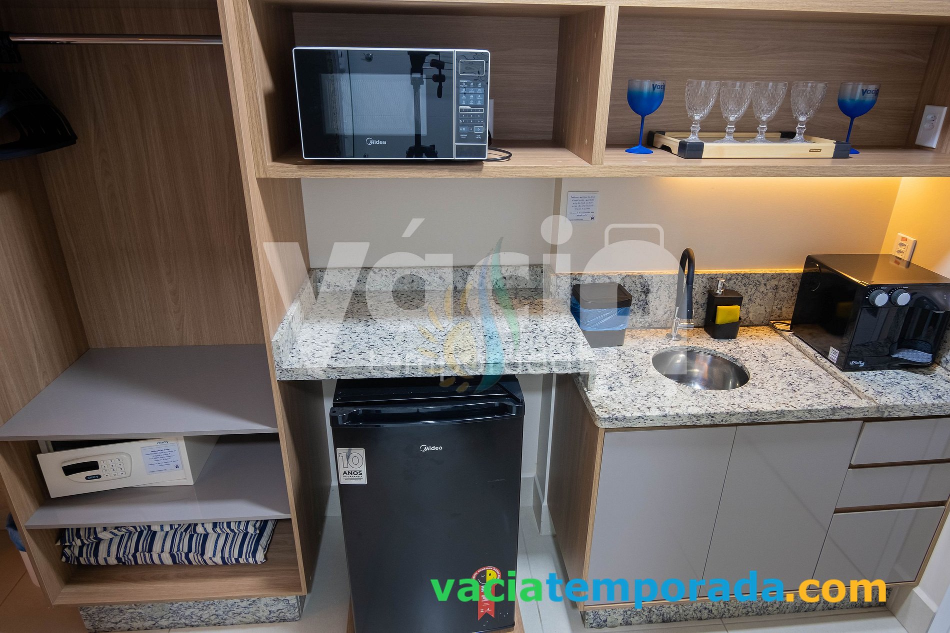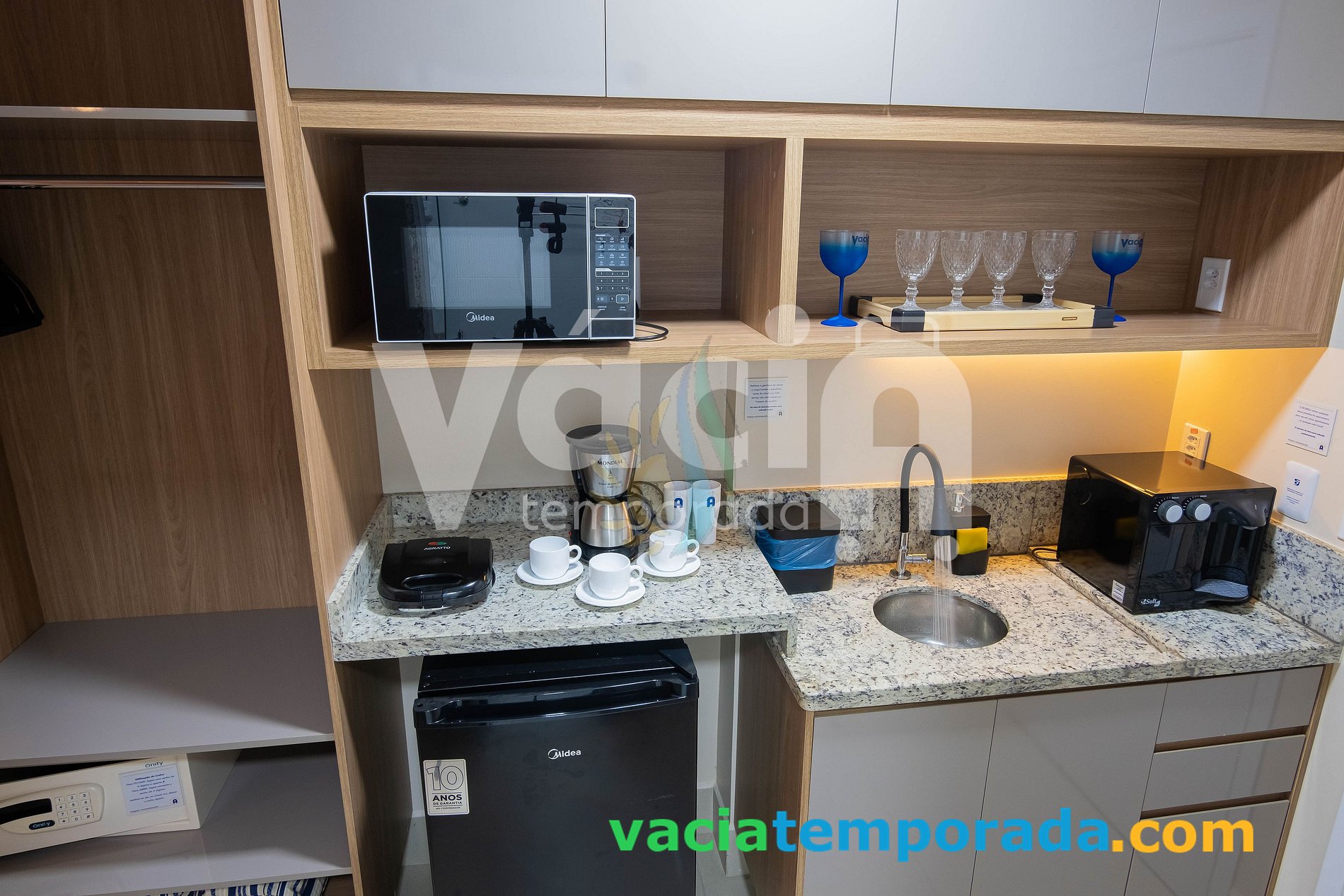 **Copa: frigobar ;Purificador de água gelada; Micro-ondas ;Sanduicheira ;Cafeteira; Pratos, copos, xícaras; talheres; Utensílios básicos para se fazer lanche. (É proibido cozinhar no apartamento (multa 30% valor condominio) Não tem fogão!
